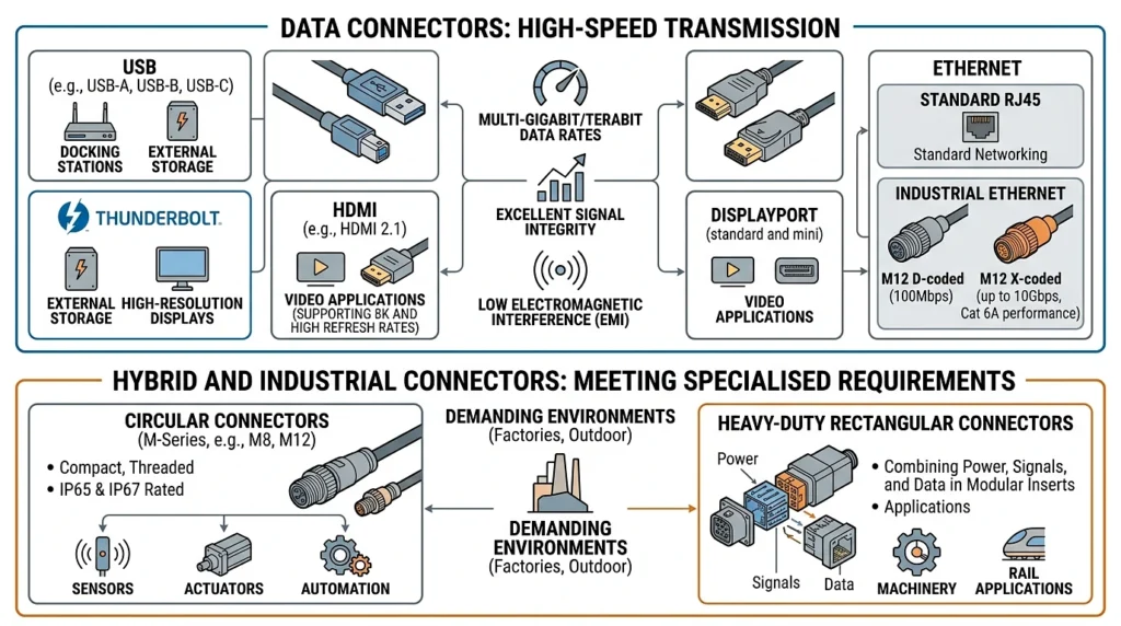 HDMI and DisplayPort connectors, meanwhile, are extensively depended on for video applications, with HDMI 2.1 supporting 8K and high refresh rates.